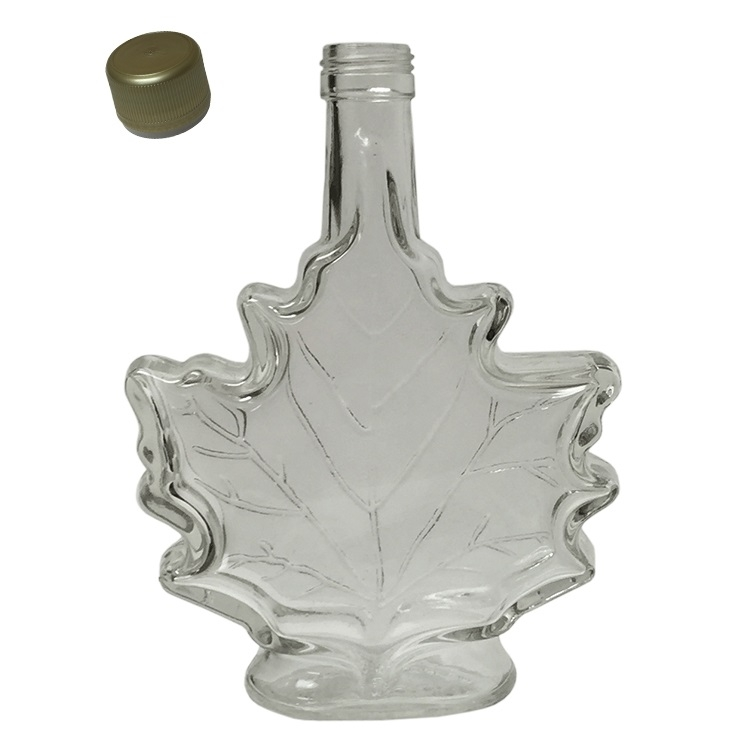 250 ml. Maple Leaf shaped glass bottle. Includes gold cap.