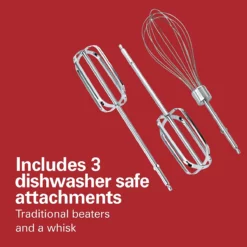 The Hamilton Beach hand mixer includes everything you need to start mixing. It comes with 2 dishwasher safe traditional beaters and a whisk. All the accessories store neatly in the snap-on storage case.
