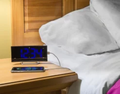 Atomic time with the newest technology; This alarm clock has a blue curved display which offers a larger and easier to read display at all angles. Easy-to-use charging port for your phone while you sleep.