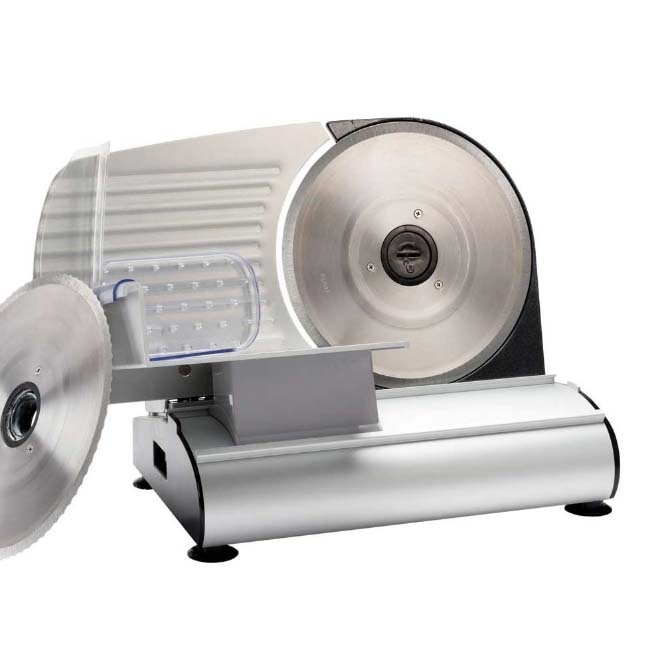 Step up to belt-driven performance. Everything you love in a home use slicer with a quiet, belt-driven blade to stand up to even the toughest tests. The large blade allows you to slice taller cuts of meat deli thin. Easily swap in the serrated blade to slice fibrous meats or cheeses. Sturdy aluminum frame with suction feet for added stability. Easily disassembles for clean-up. Clear plastic, removable hand guard. Easy-to-read precise thickness dial. Slices ultra thin to .625″ thick. Includes 2 stainless steel blades (both serrated and straight) with quick remove dials. Disassembles without tools. Five foot flexible cord. ETL Approved.