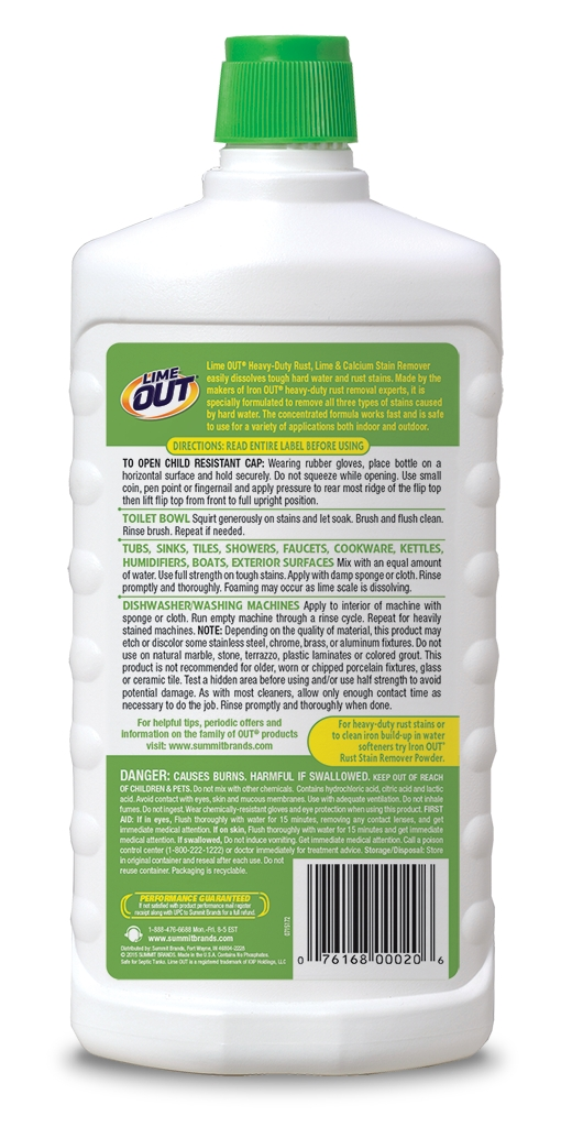Our heavy-duty, concentrated formula quickly dissolves tough hard water and rust stains as it clings to surfaces for maximum cleaning power. This calcium, rust and lime cleaner effectively removes hard water deposits and stains from a variety of surfaces. Lime OUT is great for use on tubs, toilets, sinks, showers, faucets, appliances and exterior surfaces.
