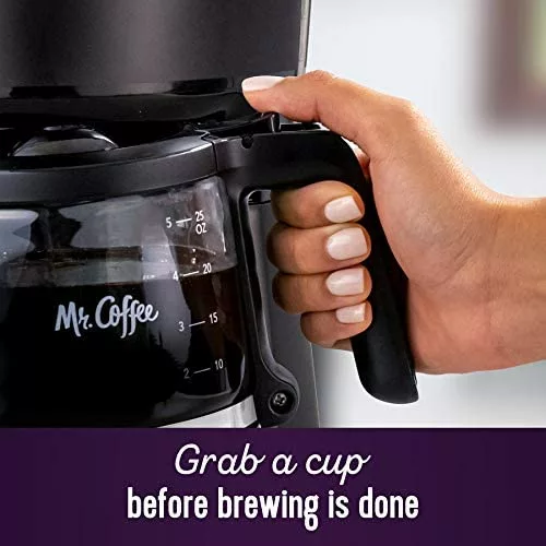 Enjoy great coffee simply made with this Mr. Coffee® 12-Cup Coffee Maker; just turn it on, brew, and enjoy. The Grab-a-Cup Auto Pause feature stops the brewing cycle so you can pour a cup, and then continues brewing until complete. The easy switch with power indicator lights up to show the coffee maker is on, or to remind you to shut it off. This easy coffee maker is simple to clean and care for, and includes a Mr. Coffee water filtration system to help remove chlorine and improve coffee taste.
