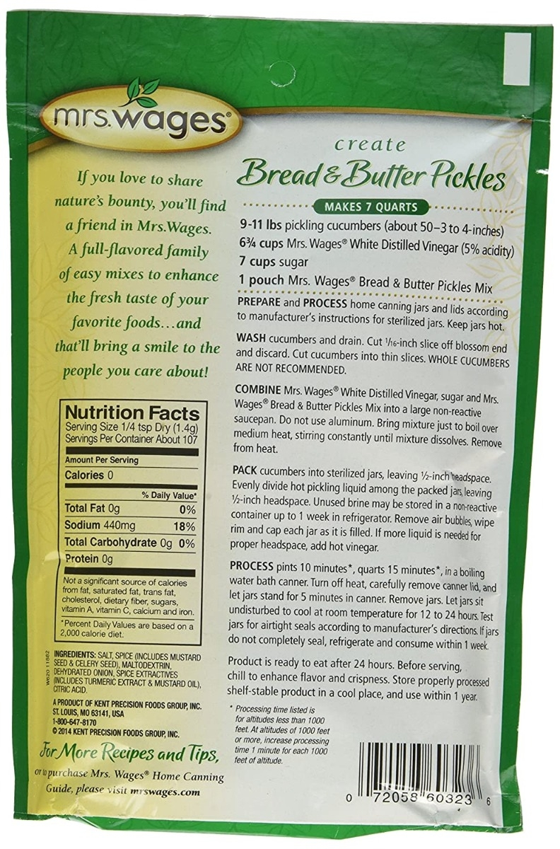 Mrs. Wages Quick Process Bread & Butter Pickles Mix is a tender, sweet pickle mix with onions for added flavor and natural herbs and spices. Before beginning any canning project, be sure to familiarize yourself with the process, the equipment you need and the ingredients. A boiling water bath method is used for the quick process recipes. Each pack makes 7 quarts of crisp, crunchy pickles – the best price and quality value in canning. Pickles are ready to eat 24 hours after preparation.