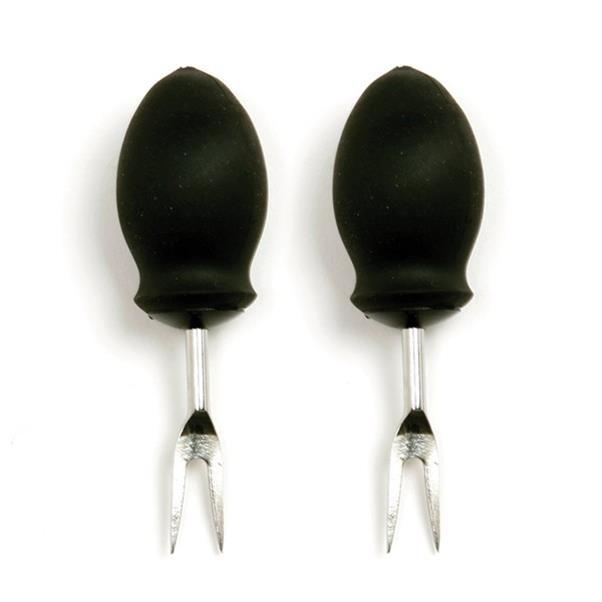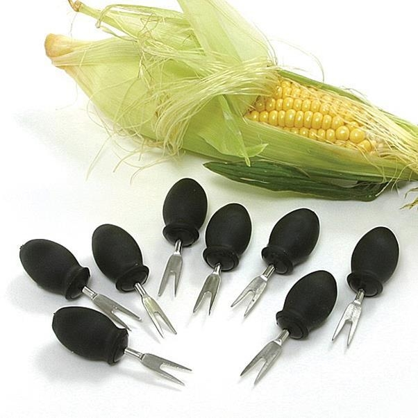 8 deluxe corn holders with non-slip, heat resistant, comfort grip santoprene handles with stainless steel prongs.