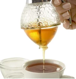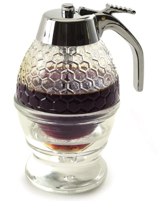 A sophisticated alternative to those pudgy plastic honey bears, this honey dispenser releases a thin drizzle of honey into your tea or steamed milk or on top of toast, hot cereal, pancakes or cornbread. The dispenser is made of glass, not plastic, with an attractive honeycomb relief. When you press the spring trigger, which is attached to the lid, honey flows from the glass nipple at the bottom of the dispenser. Release the trigger and an inner stopper mechanism closes to prevent drips. Keep the inside of the stand honey-free, and avoid overfilling the container. To prevent honey from forming a crust at the bottom, limiting the flow, rinse the glass nipple after use. To liquefy congealed honey, run warm water over the glass. This simple item will quickly become indispensable at your breakfast table.