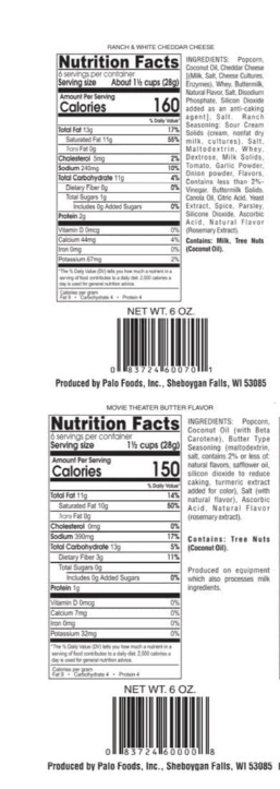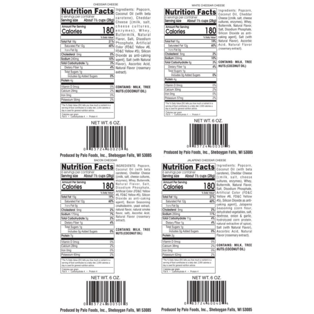 Bacon Cheddar Our Bacon Cheddar, the latest addition to the Palo Popcorn lineup, has become one of our most popular sellers and most talked about flavors. Pure coconut oil, non-GMO seed, salt, REAL cheddar cheese, and our unique bacon seasoning. Mmm…Bacon. |
