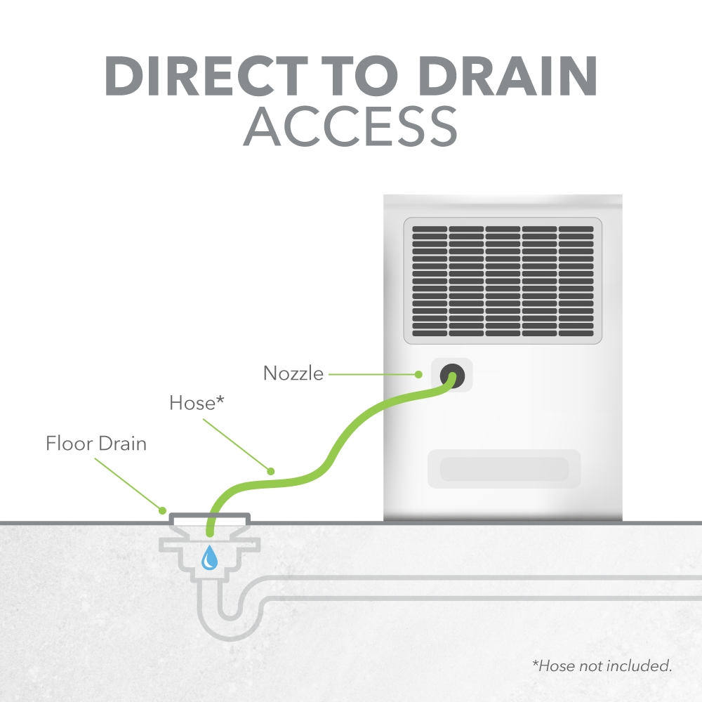 Direct to drain option allows for continuous drainage of the unit, giving the dehumidifier the ability to drain through a standard garden hose into a nearby water drain. No more bucket emptying duty! (hose not included)