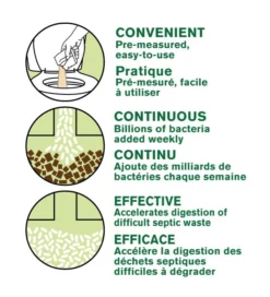 Effective:Ā The bacteria in SeptoBac septic tank treatment are specially selected by leading environmental scientists to be effective under a wide range of waste and septic system conditions. Billions of bacteria in each gram of SeptoBac powder digest both organic and difficult-to-degrade septic waste such as paper, wipes, cleaning and laundry chemicals, oils and grease. SeptoBac also contains microbial nutrients to stimulate and strengthen regular bacteria levels.