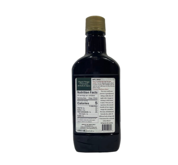 Raw Organic Apple Cider Vinegar (with the mother), Filtered Water, Apple Juice Concentrate, Less than 2% of: Concord Grape Juice Concentrate, Tart Cherry Juice Concentrate, Elderberry Juice Concentrate, Muscadine Grape Juice Concentrate, Flavor Extracts (Glycerin, Muscadine Grape Seeds**, Elderberries*, Elder Flower*, Lemon Balm*, Fenugreek Seeds*, Chamomile*, Juniper Berries*, Wild Cherry Bark*, Fennel Seeds*, Green Tea*,Star Anise*, Thyme*, Dandelion Root*, Burdock Root*, Cinnamon*, Cloves*, Ginger*, Turmeric*, Cayenne*, Black Pepper*), Potassium Sorbate (preservative), Citric Acid.